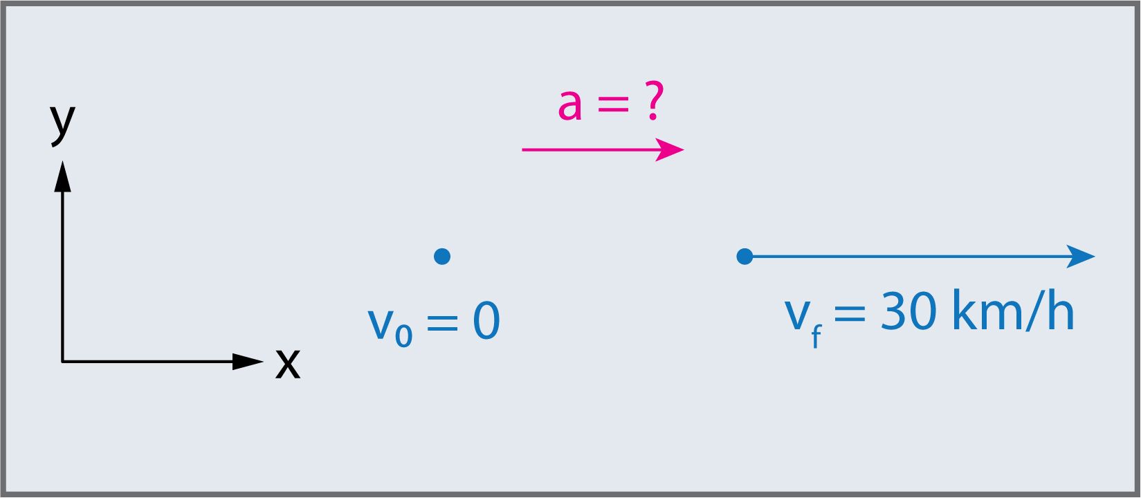 \[a_{moy}=\dfrac{\Delta v}{\Delta t}=\dfrac{+30.0\,km/h}{20.0\,s}\]Puisque les unités sont mélangées (nous avons à la fois des heures et des secondes pour le temps), nous devons tout convertir en unités SI de mètres et de secondes. (Notez qu’il est souvent plus judicieux de convertir les données dans les unités SI (\(m\) et \(s\)) au début du problème.)