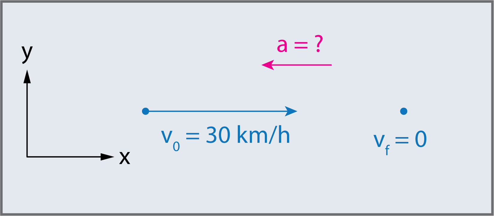 Identifiez les éléments connus: \(v_{0}=0\), \(v_{f}=-15.0\,m/s\) (le signe négatif indique la direction vers l’ouest), \(\Delta t=1.80\,s\)