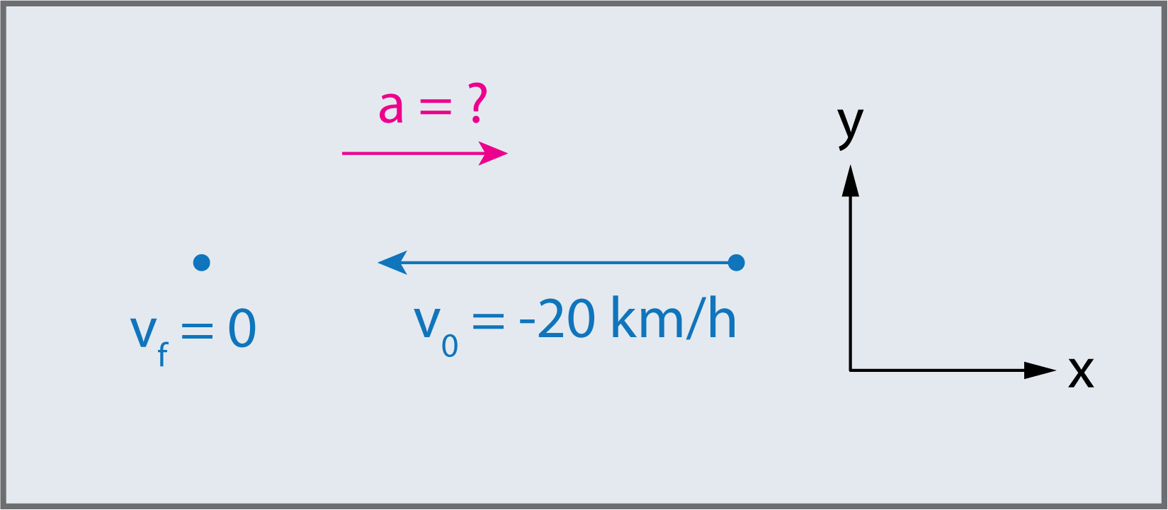 Identifiez les éléments connus: \(v_{0}=-20.0\,km/h\), \(v_{f}=0\,km/h\), \(\Delta t=10.0\,s\).