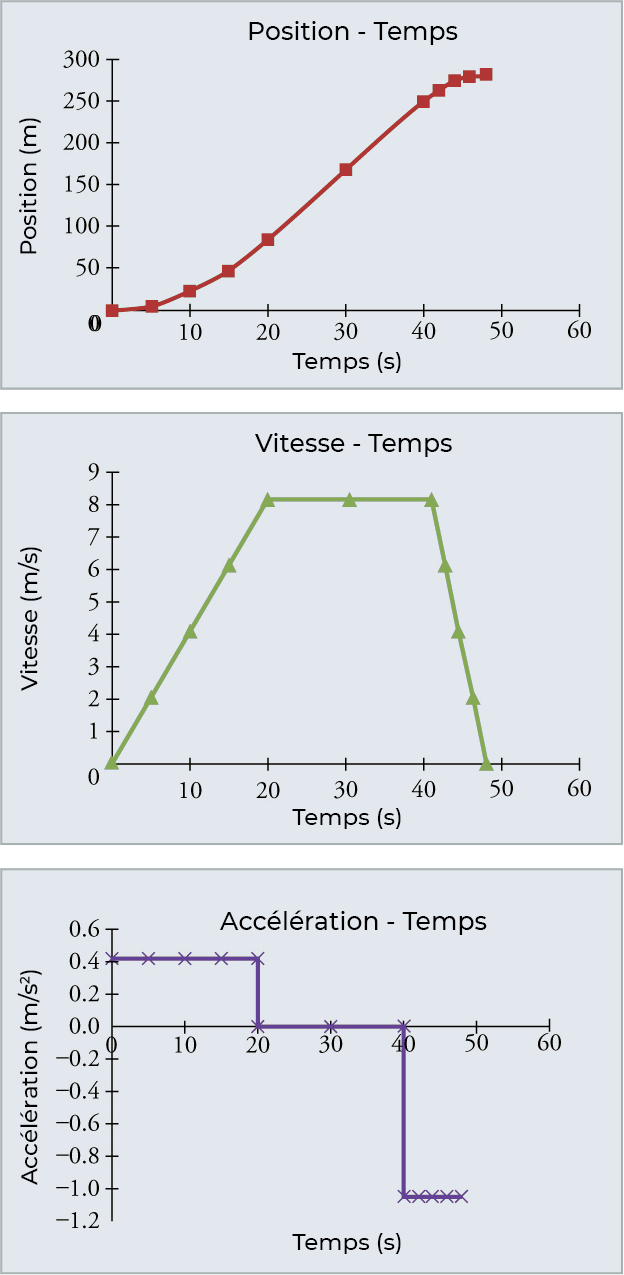 L’accélération est positive, donc dirigée vers la droite. Ceci est raisonnable car le train part du repos et se termine avec une vitesse vers la droite (également positive). L’accélération est donc dans le même sens que le changement de vitesse, comme c’est toujours le cas.