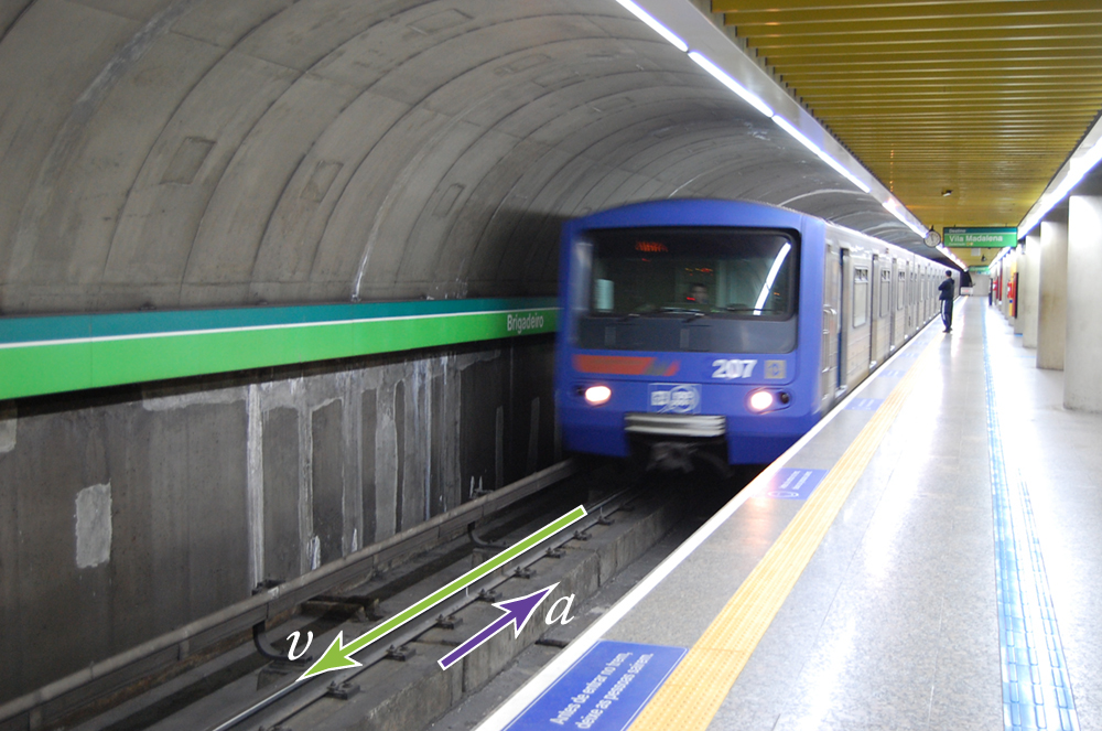 Fig. 4.1 Une rame de métro à Sao Paulo, au Brésil, décélère lorsqu’elle entre dans une gare. Son accélération est dans une direction opposée à sa vitesse et à sa direction de mouvement. (crédit : Yusuke Kawasaki,Flickr)#