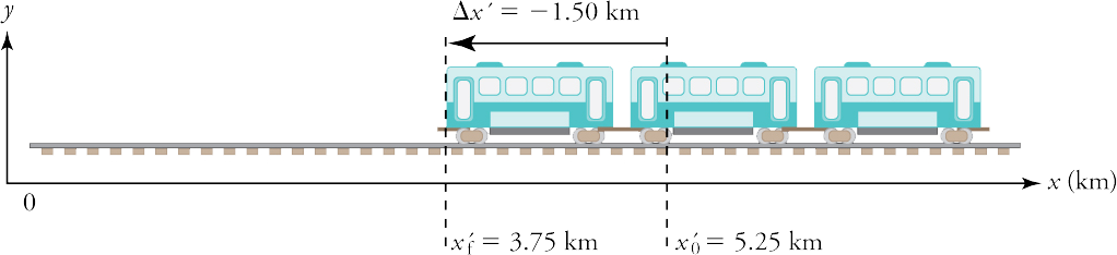 \[\Delta x'=x'_{f}-x'_{0}=3.75\,km-5.25\,km=-1.50\,km\]