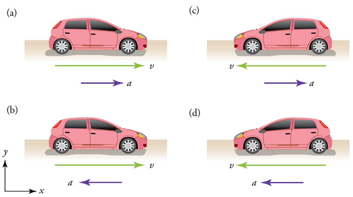 La décélération fait toujours référence à une accélération dans la direction opposée à la direction de la vitesse. La décélération réduit toujours la vitesse. Une accélération négative, cependant, est une accélération dans la direction négative du système de coordonnées choisi. Une accélération négative peut être ou non une décélération, et une décélération peut ou non être considérée comme une accélération négative. Par exemple, considérons la Fig. 4.2.