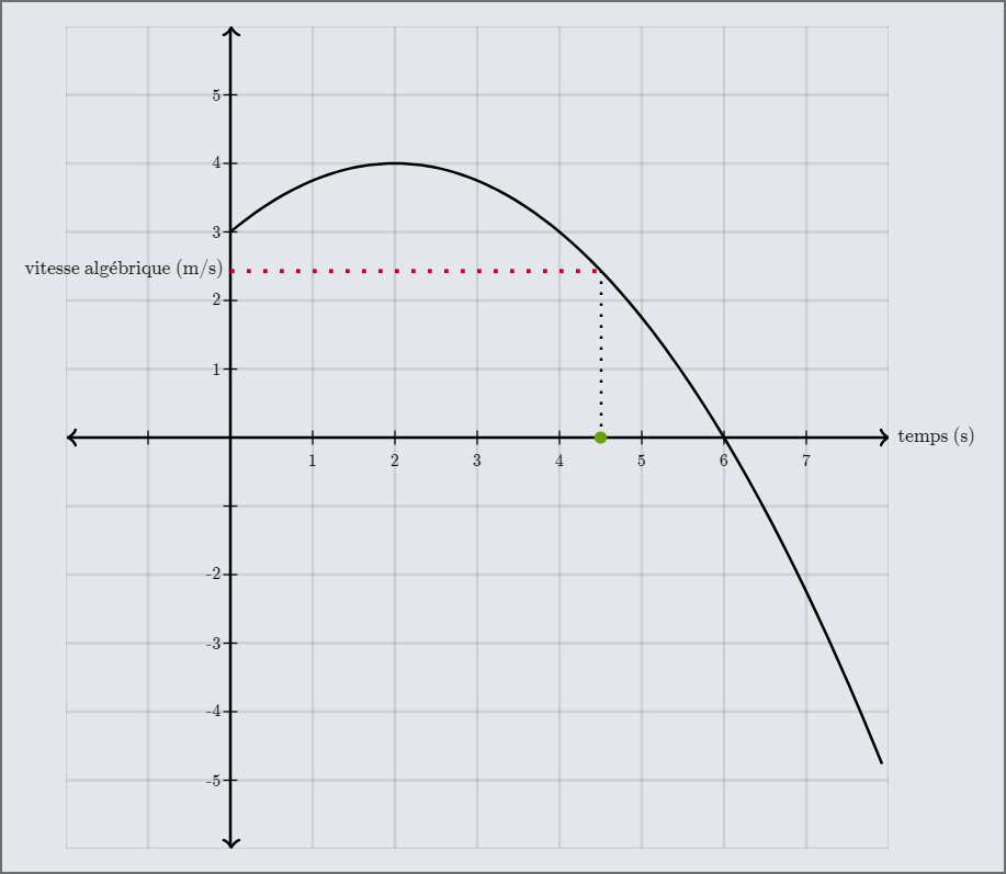On détermine l’accélération à l’instant \(4\,s\) en calculant la pente de la courbe de \(v(t\)) à cet instant.