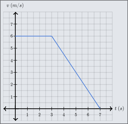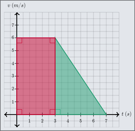 On détermine le déplacement du kart en calculant l’aire sous la courbe de \(v(t)\). Cette aire est constituée de deux parties: un rectangle, entre les instants \(0\,s\) et \(3\,s\), et un triangle, entre les instants \(3\,s\) et \(7\,s\). Une fois qu’on aura additionné les aires de ces deux formes géométriques, on aura le déplacement total.