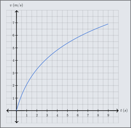 Cela pourrait sembler contre-intuitif puisqu’à en voir la courbe, la vitesse de la véliplanchiste augmente. En réalité, la valeur de cette augmentation par seconde diminue. Pour les \(4.5\) premières secondes, la vitesse est passée de \(0\,m/s\) à \(5\,m/s\), alors que pour les \(4.5\) secondes suivantes, elle est seulement passée de \(5\,m/s\) à \(7\,m/s\)