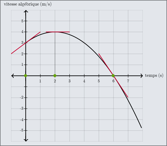 A \(t=2\,s\) la pente est nulle puisque la tangente à la courbe est horizontale. L’accélération est alors nulle à cet instant.