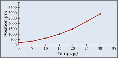 En prenant la pente de la courbe de la figure ci-dessous, vérifiez que l’accélération est \(3.2\,m/s^{2}\) à \(t=10.0\,s\).