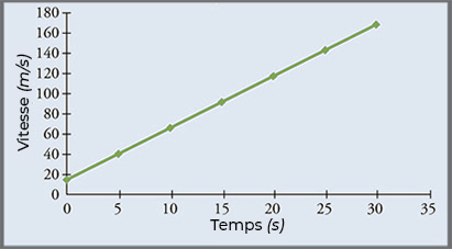 \(\text{pente}=a=\dfrac{v_{B}-v_{A}}{t_{B}-t_{A}}=\dfrac{225\,m/s-160\,m/s}{20.0\,s-0.0\,s}=\dfrac{65\,m/s}{20.0\,s}=3.25\,m/s^{2}\simeq 3.2\,m/s^{2}\)