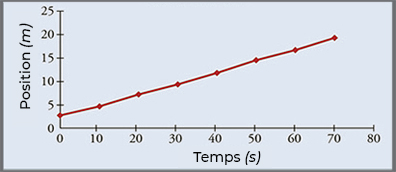 On a donc : \(\text{pente}=v=\dfrac{x_{B}-x_{A}}{t_{B}-t_{A}}=\dfrac{10.0\,m-0.0\,m}{2.5\,s-0\,s}=\dfrac{10.0\,m}{2.5\,s}=4.0\,m/s\)