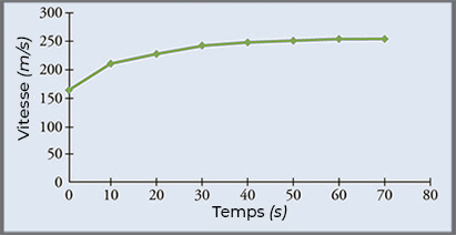 On prend les points \(A=(0.0\,s; \sim 160\,m/s)\) et \(B=(20.0\,s; \sim 225\,m/s)\)