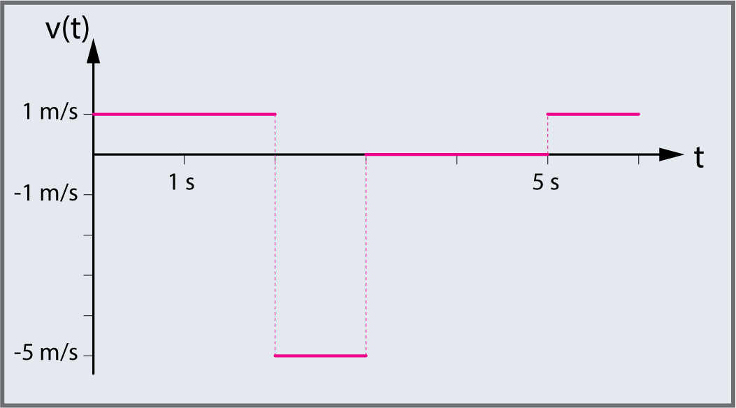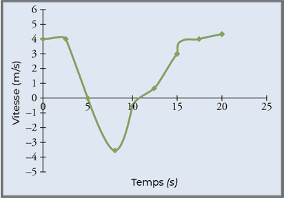 L’accélération est infinie (pente\(=a=\dfrac{\Delta v}{\Delta t}=\infty\)), car la vitesse de l’objet change de direction (signe) de manière instantanée.