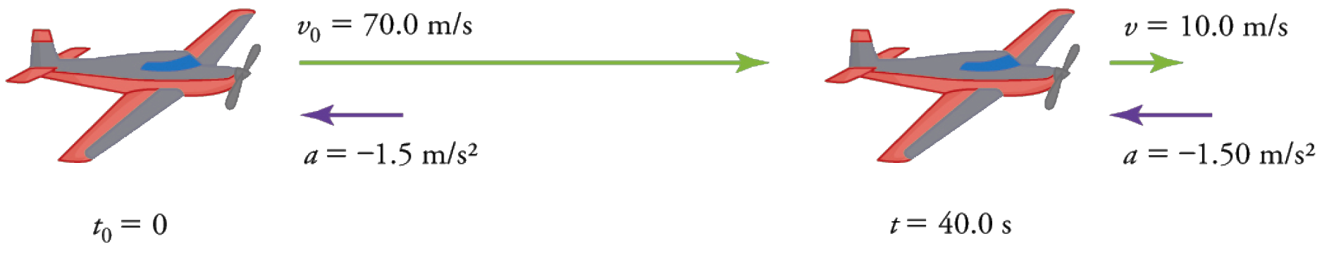Un avion vol à la vitesse de \(70\,m/s\) puis décélère à un taux de \(1.50\,m/s^{2}\) pendant \(40\,s\) pour atterrir.