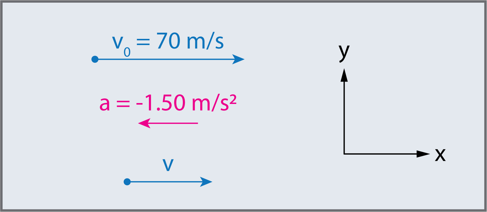 Comme on ne connaît pas le déplacement \(\Delta x\) et puisque le déplacement \(\Delta x\) n’est pas non plus demandé, on utilise la première équation cinématique: \(v(t)=a\cdot t+v_{0}\), dans laquelle \(\Delta x\) n’apparaît pas.