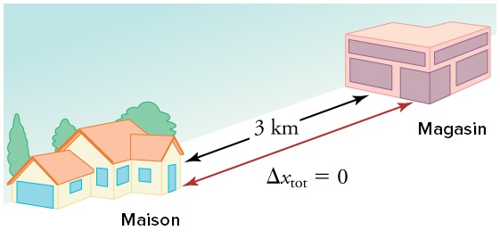Fig. 3.7 Pour un aller-retour au magasin durant 30 minutes, la distance totale parcourue est de \(6\,km\). La vitesse scalaire moyenne est alors de \(12\,km/h\). Par contre, le déplacement lors du trajet étant nul (pas de différence entre la position initiale et la position finale), la vitesse moyenne est aussi nulle. (crédit: openstax.org)#