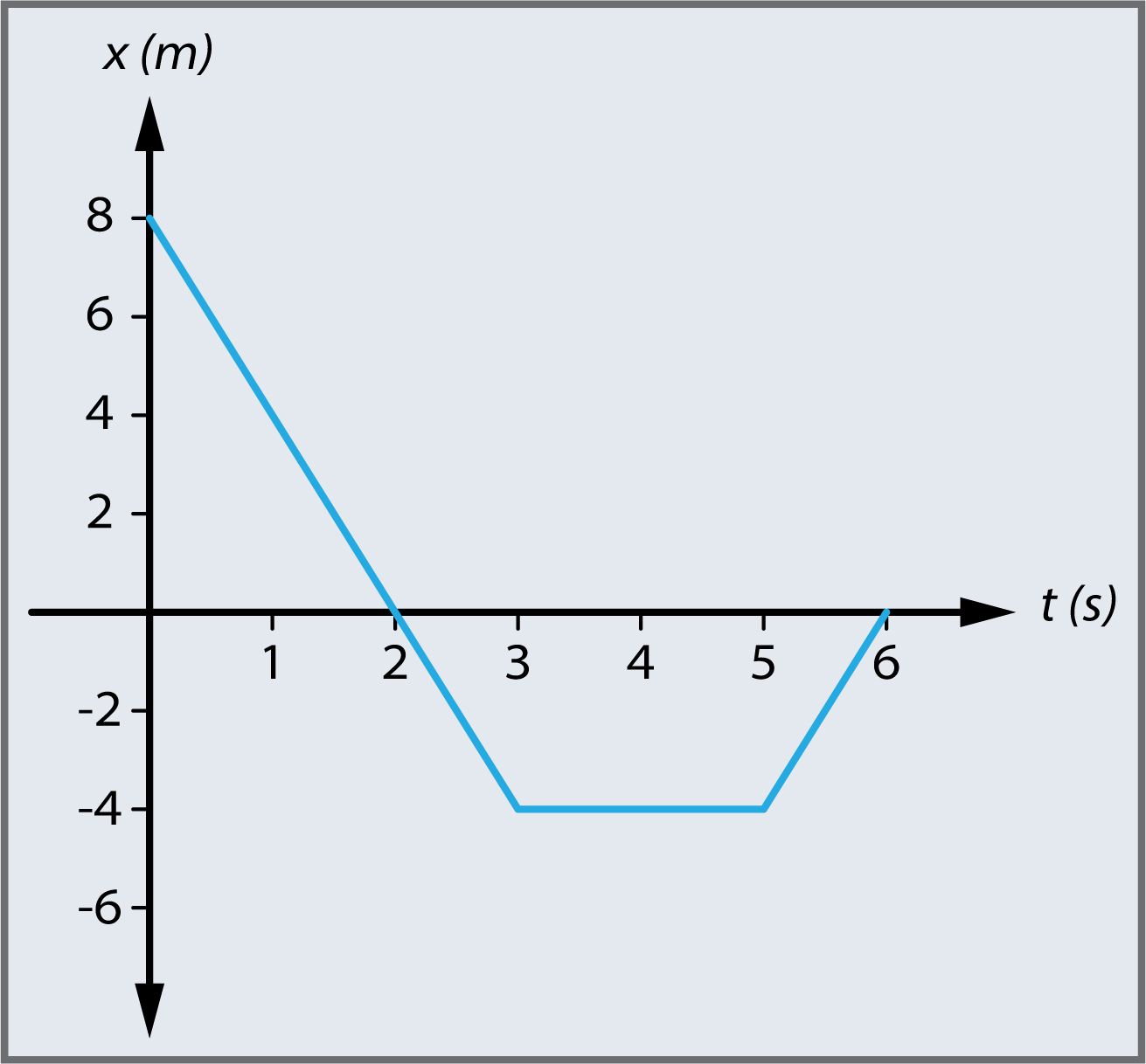Puis, entre les instants \(t=3\,s\) et \(t=5\,s\), il a nagé sur une distance de \(0\) mètres puisqu’il est resté en \(x=-4\,m\) sans bouger.