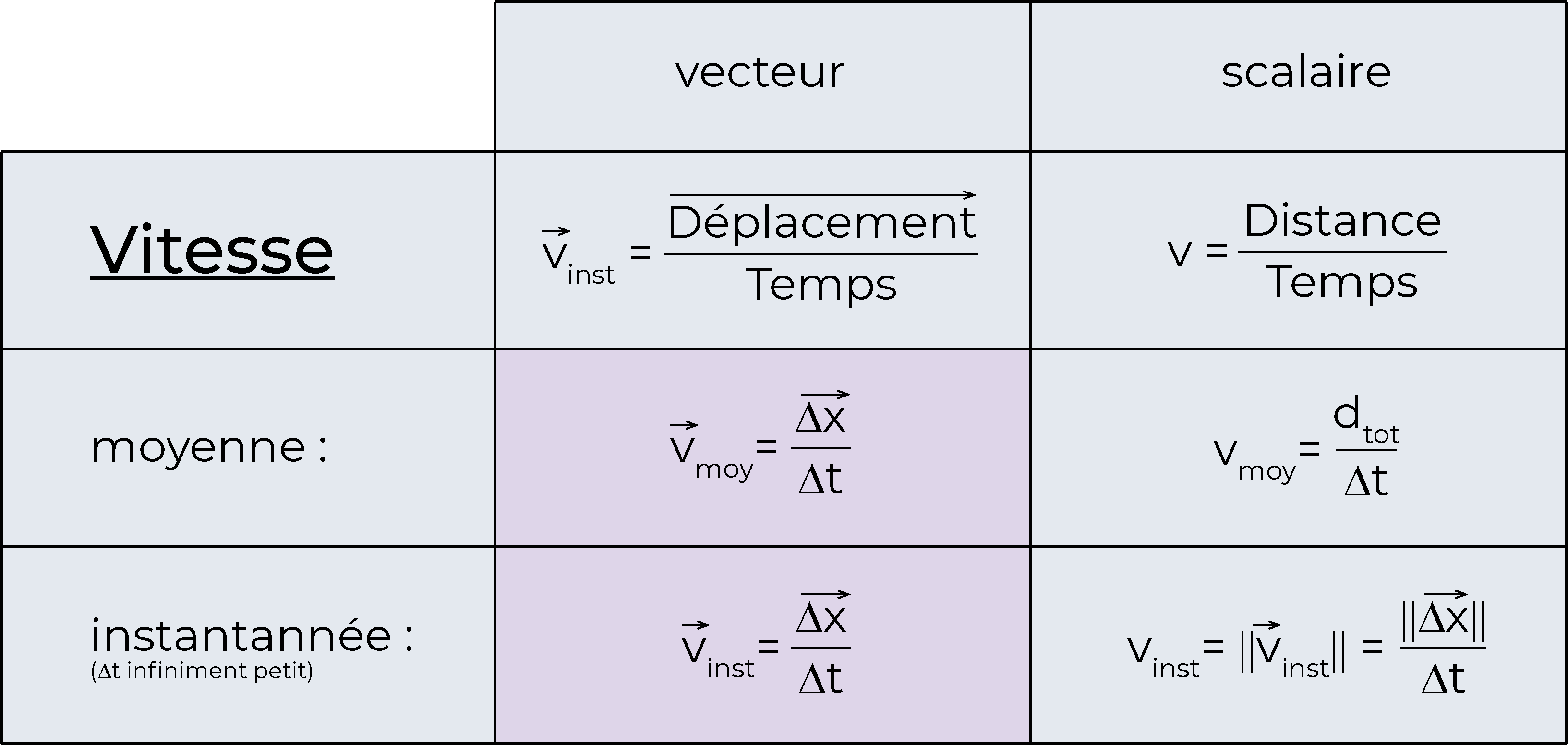 Dans le langage courant, on utilise surtout la notion de vitesse scalaire, et très peu celle de vitesse. En physique, ces deux notions n’ont pas la même signification. La différence principale est que la vitesse scalaire est un scalaire (!), elle n’a pas de sens ni de direction, contrairement à la vitesse qui, elle, a un sens (sa direction étant celle du mouvement à une dimension). Tout comme on avait distingué la vitesse moyenne de la vitesse instantanée, on fait la distinction entre la vitesse scalaire moyenne et la vitesse scalaire instantanée.