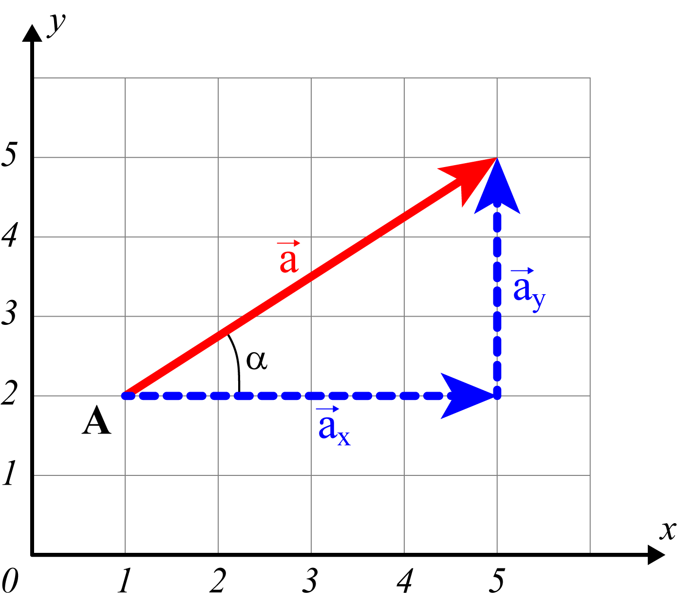 Le vecteur oblique \(\vec{a}\) se décompose ainsi en un vecteur \(\vec{a_{x}}\) et un vecteur \(\vec{a_{y}}\).