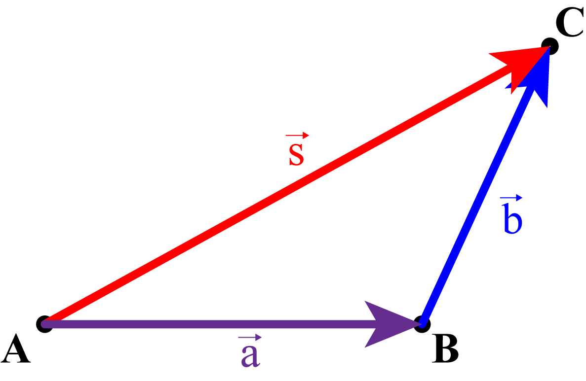 Fig. 3 \(\overrightarrow{AC}=\vec{s}\) est la somme vectorielle des vecteurs \(\overrightarrow{AB}=\vec{a}\) et \(\overrightarrow{BC}=\vec{b}\)#