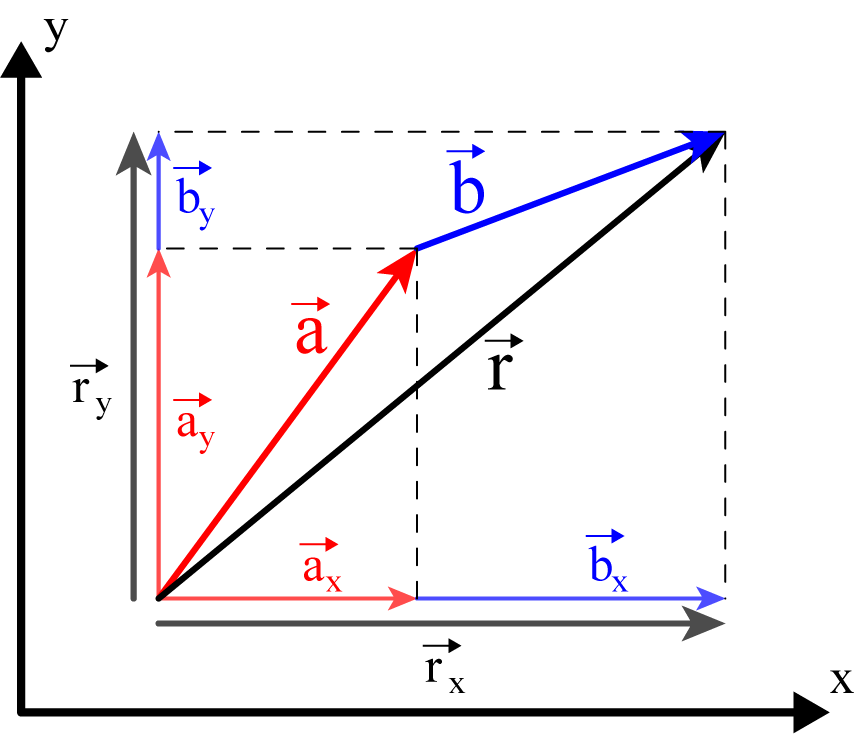 Une fois le système d’axes \(0xy\) placé, le vecteur oblique \(\vec{a}\) ou \(\vec{b}\) peut se décomposer en deux vecteurs qui sont les composantes horizontale et verticale