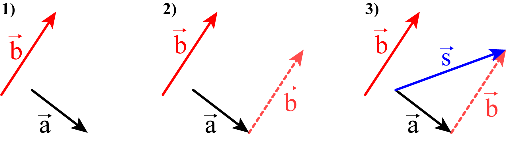 La construction géométrique \(\vec{a}+\vec{b}\), illustrée à la Fig. 4, consiste à faire glisser le vecteur \(\vec{b}\), sans en modifier ni l’intensité, ni le sens, et de faire coïncider son origine avec l’extrémité du vecteur \(\vec{a}\). Le vecteur résultant \(\vec{s}=\vec{a}+\vec{b}\) a pour origine celle du vecteur \(\vec{a}\) et pour extrémité celle du vecteur \(\vec{b}\).