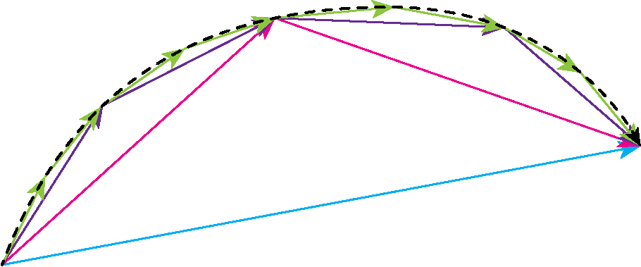 Sur la Fig. 2.5, la trajectoire réelle d’un objet (en traitillé) peut être approximée par un (ou plusieurs) mouvement rectiligne. Plus le découpage de la trajectoire est important plus la succession des petits mouvements rectilignes se rapprochera de la trajectoire réelle. En bleu, il n’y a aucun découpage, l’approximation est grossière. En rose, le mouvement a été découpé en deux parties rectiligne. On gagne de l’information sur la trajectoire réelle. En Violet, le mouvement est découpé en quarte parties rectiligne. On se rapproche de la courbe de la trajectoire. Finalement, en vert, le mouvement est découpé en huit parties rectilignes qui sont une bonne approximation de la courbe réelle.