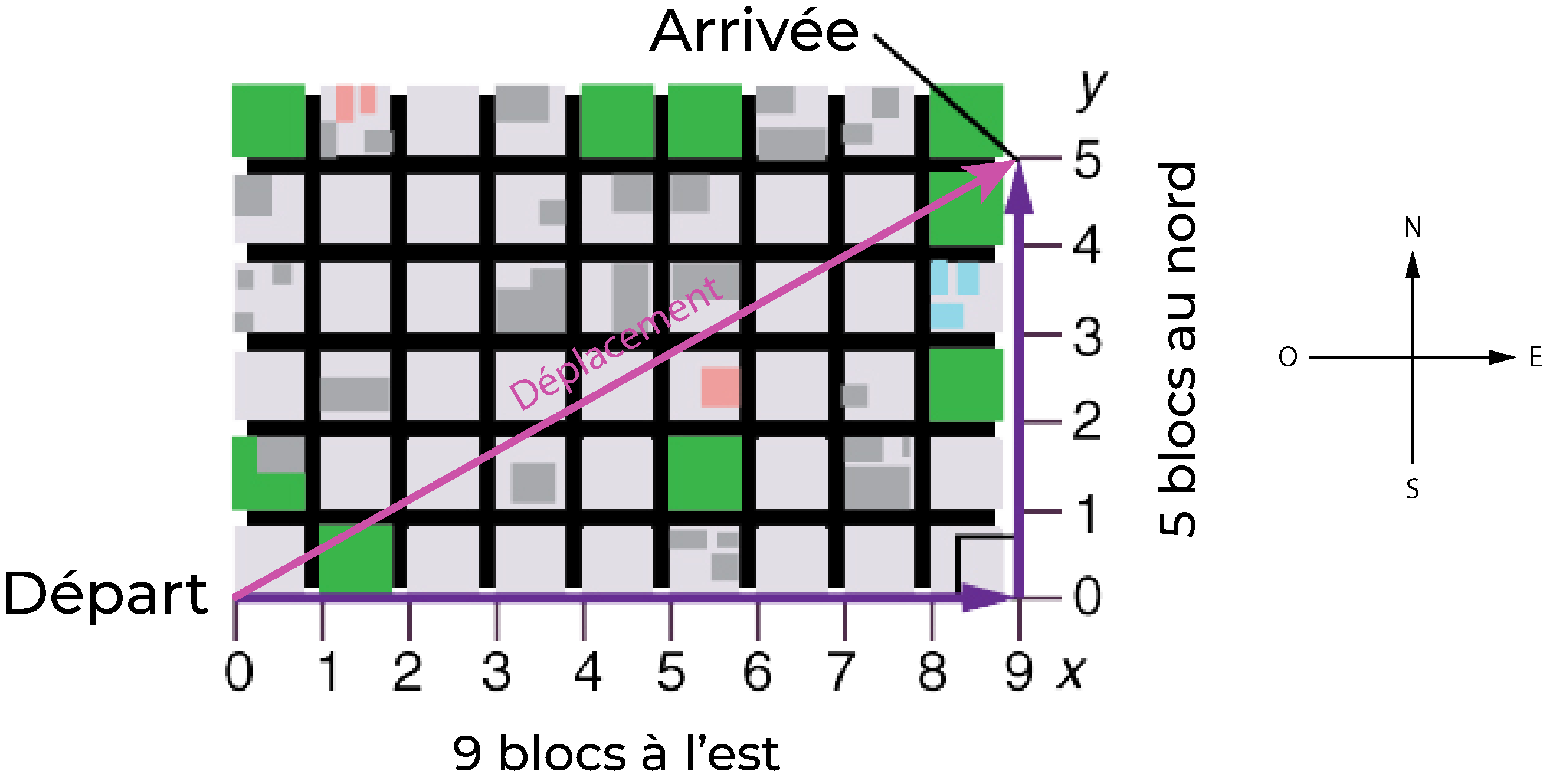 Si on veut décrire le mouvement du piéton, dans le repère Nord/Sud-Est/Ouest, on dira qu’il s’est déplacé de 9 blocs à l’est, suivi de 5 blocs au nord. Il marche vers l’est puis vers le nord (deux directions perpendiculaires). La distance parcourue vers l’est est affectée uniquement par son mouvement vers l’est. De même, la distance parcourue vers le nord n’est affectée que par son mouvement vers le nord.