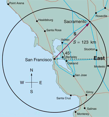 Si on dit à un pilote d’avion de parcourir \(123\,km\) en ligne droite pour se rendre de San Francisco à Sacramento, expliquez pourquoi il pourrait se retrouver n’importe où sur le cercle illustré à la figure ci-dessous. De quelles autres informations aurait-il besoin pour se rendre à Sacramento ?