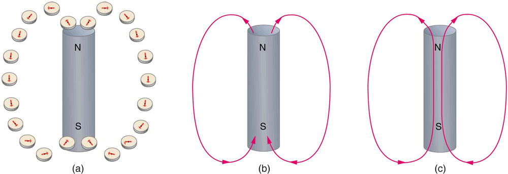 Fig. 11.12 Les lignes de champ magnétique sont définies comme ayant la direction indiquée par une petite boussole lorsqu’elle est placée à un endroit. (a) Si de petites boussoles sont utilisées pour cartographier le champ magnétique autour d’un barreau magnétique, elles pointeront dans les directions indiquées : loin du pôle nord de l’aimant, vers le pôle sud de l’aimant. (Rappelez-vous que le pôle nord magnétique de la Terre est en fait un pôle sud en termes de définitions des pôles sur un barreau magnétique.) (b) La connexion des flèches donne des lignes de champ magnétique continues. L’intensité du champ est proportionnelle à la proximité (ou à la densité) des lignes. (c) Si l’on pouvait sonder l’intérieur de l’aimant, on trouverait que les lignes de champ forment des boucles fermées continues.#